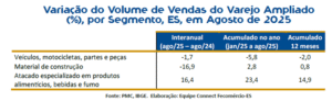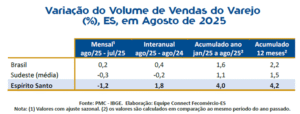 De acordo com André Spalenza, coordenador do Observatório do Comércio do Connect Fecomércio-ES, o desempenho reflete a força do consumo no estado e o dinamismo das empresas locais. “O comércio capixaba tem mostrado consistência no crescimento, sustentado por fatores como a recuperação da renda das famílias, a confiança do consumidor e a modernização das estratégias de vendas”, afirmou.
