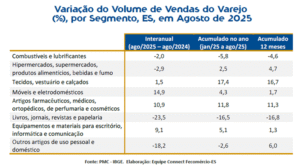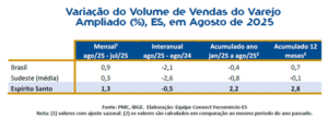 As análises são do Connect Fecomércio-ES (Federação do Comércio de Bens, Serviços e Turismo do Espírito Santo), com base nos dados da Pesquisa Mensal do Comércio (PMC), do Instituto Brasileiro de Geografia e Estatística (IBGE).